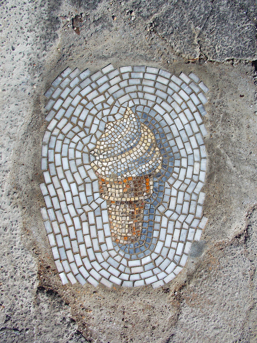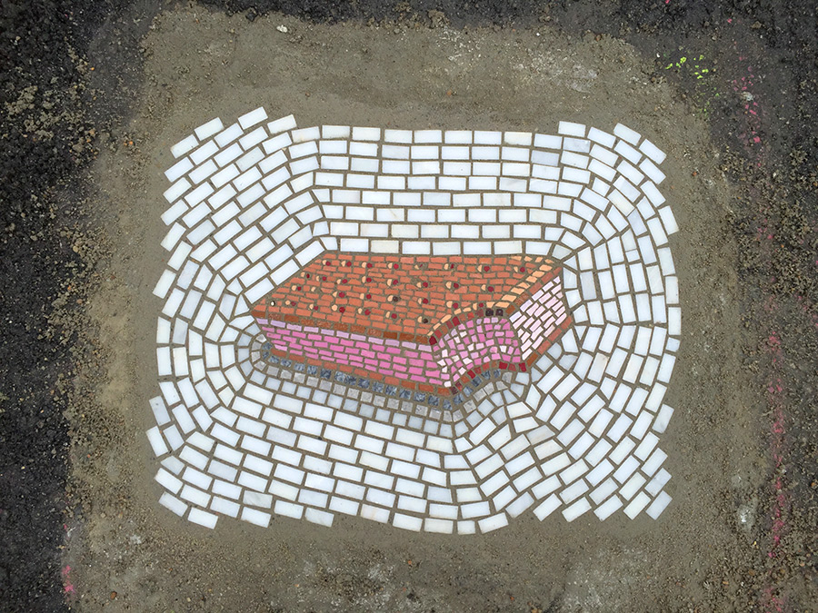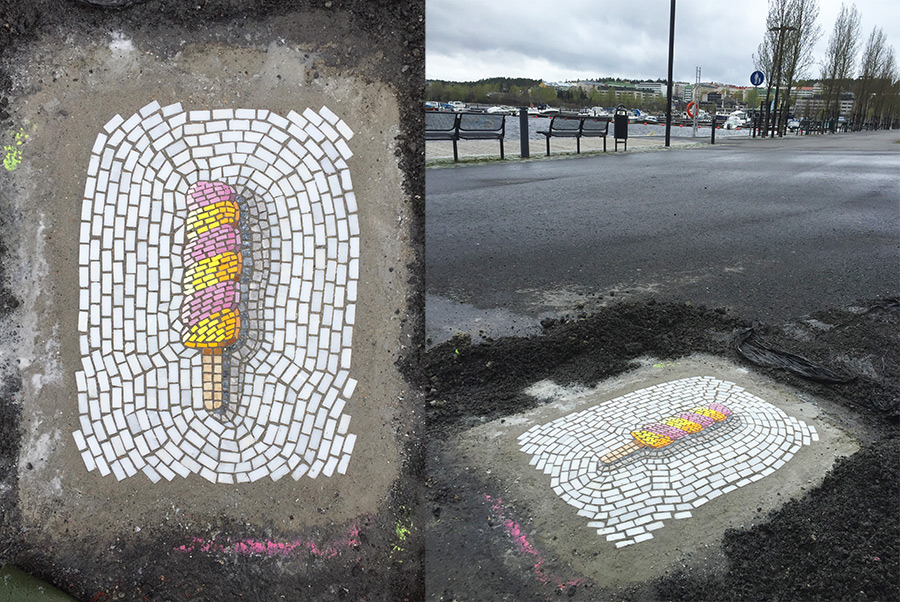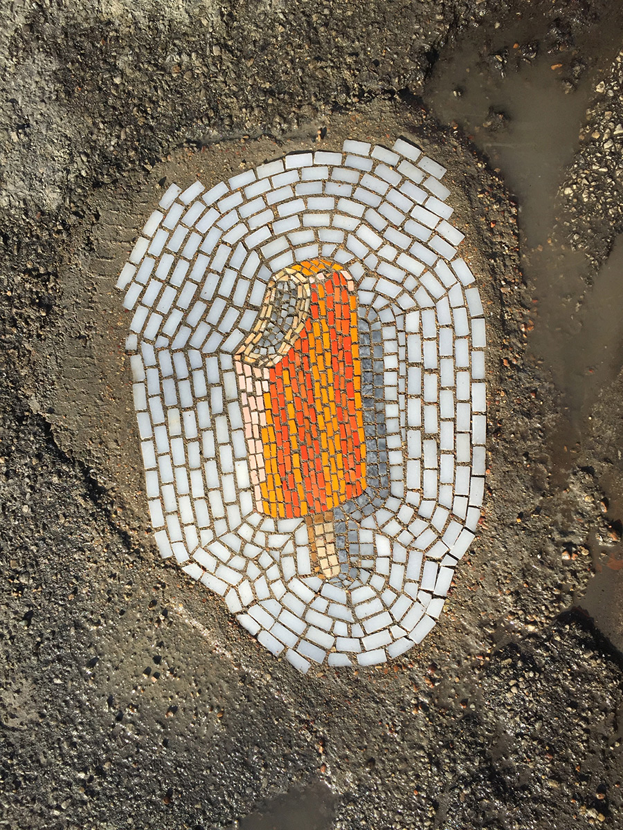 Jim Bachor approfitta infatti delle voragini nell’asfalto per creare gelati fatti di marmo e tesserine di vetro: Treats in the Streets porta il mosaico d’artista per le strade e vi farà venir voglia di chinarvi e leccare per terra.